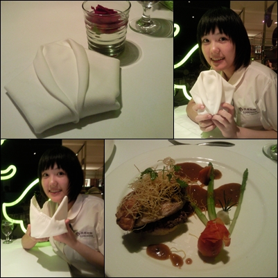 觀光科好像有學餐桌禮儀,她一進這餐廳就開始滔滔不絕的說著上課學的東西